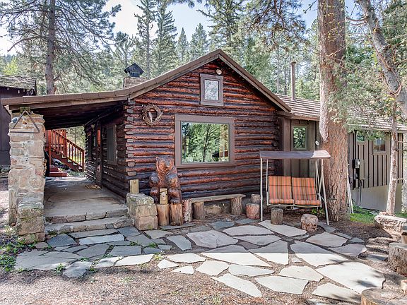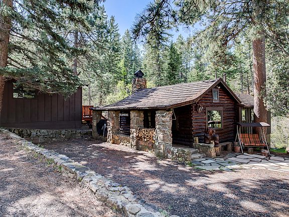 LOVELY RENOVATED 4BED/3BATH LOG HOME ON OVER 10 ACRES WITH CREEK! The charm and coziness of this vintage log cabin will draw you in, but the location and land will impress you. Open up the front door and the cabin expands inside. Lovely renovations thoughtfully done to preserve the character of the property, yet allow for a modern touch - lots of tile and stone finishes, beams, instant hot water heater! Large walkout deck off master overlooks the spring fed creek. The walkout on the lower level opens to additional deck against the creek. Large separate building currently used as office, multiple sheds and an old logging road to stroll down and venture off make this a contender for the outdoor family who love to play and explore. 2 minutes to Hwy285 without the noise makes this location highly desirable and convenient.
