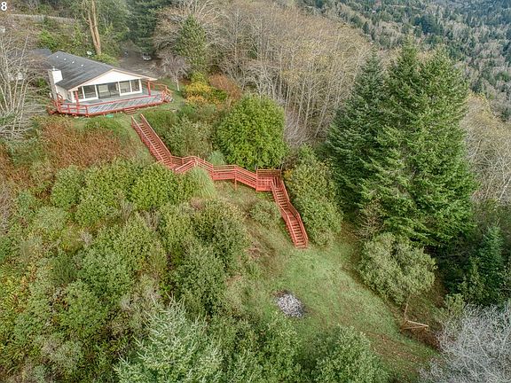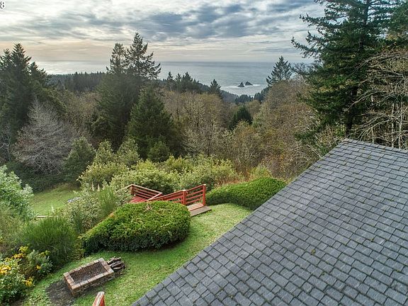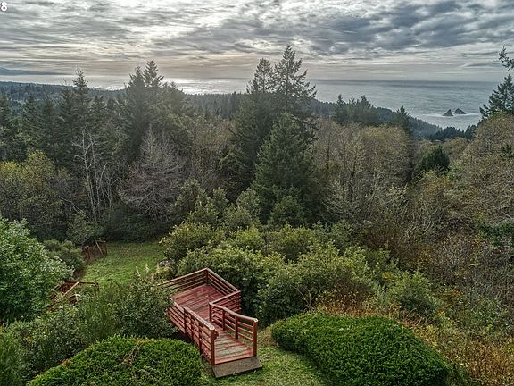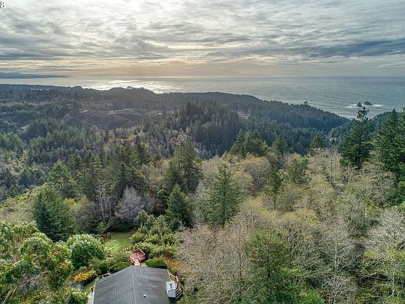 SPECTACULAR OCEAN VIEWS! See Lone Ranch's Twin Rocks from this privately located home! Driveway leads to 5.37 acres with a 1938 SF ranch home, 2 car garage & separate 24x24 shop. Views galore from the wrap around deck & open living room. Spacious kitchen, 4 bedrooms, 2 baths. Stairway and paths lead to additional open areas perfect for gardening or ?? Views can be expanded with more tree clearing. This amazing property is a MUST-SEE!
