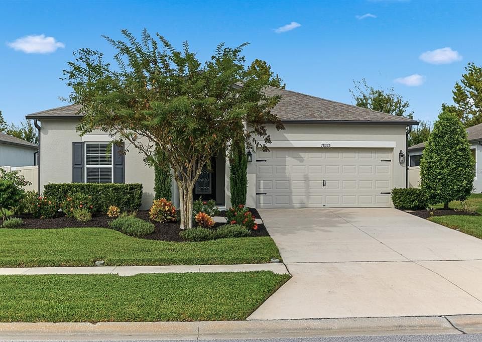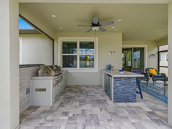 Under contract-accepting backup offers. One or more photo(s) has been virtually staged. Welcome to this sensational and highly upgraded M/I Homes Marque "B" model, ideally located in the sought-after community of Talavera! Outdoor living takes center stage with a beautifully designed outdoor kitchen enclosed in an oversized screened lanai cage enclosure and featuring a tile countertop, stone accents, under-counter ice maker, mini fridge, built-in KitchenAid propane grill, storage, paver flooring, ceiling fans, recessed lighting and built-in sourround sound to create the perfect ambiance for entertaining or relaxing. Built in 2019, this rare gem offers an extended trussed front porch with glass inlay, no rear neighbors for added privacy, and upgraded curb appeal including custom landscaping and more. The thoughtfully designed split floor plan includes 3 spacious bedrooms, 2 full bathrooms, and an open-concept living area with elegant gray ceramic wide wood-like plank tile and upgraded baseboards throughout. The gourmet kitchen features granite countertops, 42" upper cabinets with crown molding, stainless steel appliances, a custom backsplash, and a large eat-in 7 foot long island with pendant lighting and accent wall. The dinette showcases views and direct access to the outdoor oasis. The home also includes a built-in entertainment wall with a 75" TV, LED lighting, electric fireplace, shelving, motorized shades in the master and family room, a Lutron smart lighting system, and whole-home audio with speakers in every room, including the garage and patio, plus 7.1 surround sound in the family room. The luxurious primary suite offers a walk-in closet, an additional built-in closet, and a stunning en suite bath with dual vanities, a tower cabinet, step-in shower, linen closet, and private water closet with accent wall. Additional highlights include a fully fenced oversized homesite just under 1/5 acre, security camera system with NVR, laundry room with built-in cabinetry and counter, gutters, and garage storage cabinets, garage racks, insulated garage door and pedestrian door. Enjoy resort-style community amenities including a pool, clubhouse, splash pad, cabanas, playground, basketball and tennis courts. Perfectly located just one mile north of Land O Lakes and SR-52/US Hwy 41 with easy access to major highways and interstates. This remarkable home is move-in ready and sure to impress, schedule your showing today!