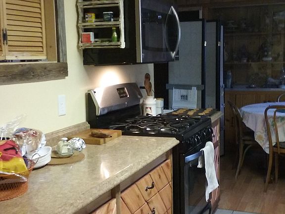 3 houses, two bdrm main house with two baths, 2 bdrm 1bath cabin, 1bdrm 1bath cabin, outdoor kitchen, LG garage,small green house, chicken pen, LG cover building for firewood and RV. Each house has stove, fridge, washer's an dryers. The 3 cabins are on front part of property and there is a huge fenced area in the back for herd animals, with water an electric available if needed. There is also a huge garden area an mature grapes, blackberries, apple trees an a pear tree. The property uses city water but there is also 2 wells that can be used in the summer months an the property has water rights.