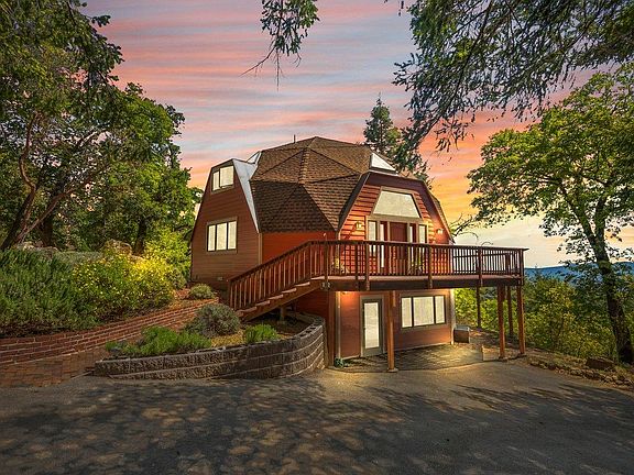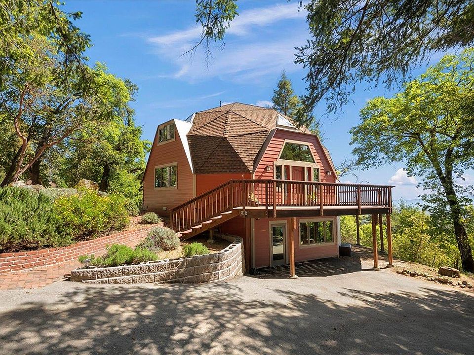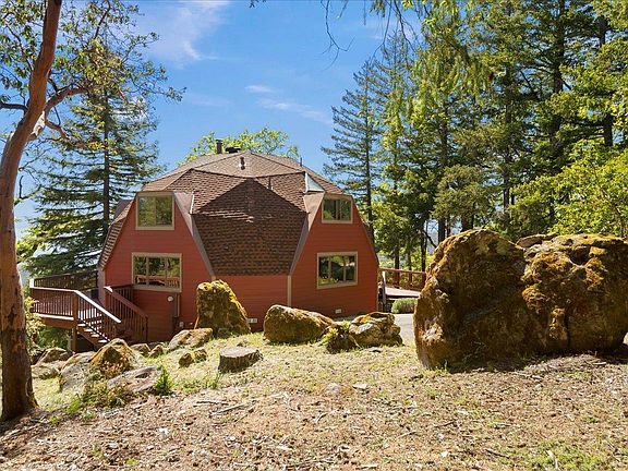 Picture perfect mountain retreat with long-range views, a parklike setting, and an architecturally stunning dome house flanked by a wrap-around deck; the indoor-outdoor living is immediately evident. In 2017 the structure was upgraded with a new roof, fireproof Hardie board siding, reinforced foundation, top-to-bottom insulation, and more. With its unique architecture, the home feels expansive and open. The kitchen boasts stainless steel appliances and a built-in desk adding to the functionality of the space. Step into the luxurious primary suite featuring a beautifully remodeled spa-like bathroom, walk-in closet, cozy fireplace, and separate office space for quiet contemplation or remote work. The lower level offers a 4th bedroom, providing flexibility and space for guests, and a spacious family room with a relaxed atmosphere and access to the leveled yard complete with a play structure and gathering area. Enjoy easy access to South Bay and Peninsula employment areas and Las Cumbres amenities such as a community garden, community center, bocce/basketball/tennis, pool, and playground. There are over 1,200+ acres of surrounding shared conservation to explore. 10Gbps Capable Community Owner Fiber Internet. Served by top-rated Lakeside Elementary and Los Gatos High.