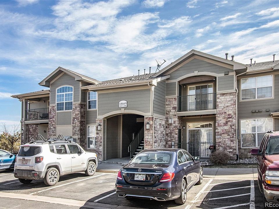 Don't miss this perfectly maintained condo in Hunter's Chase. Complete remodel in 2021. New Luxury Vinyl flooring, new carpet, new lights, ceiling fans, and plumbing fixtures. Kitchen features quartz countertops, undermount quartz/granite composite sink, and stainless-steel Whirlpool appliances. Bathrooms also feature quartz countertops. Master bath has a brand-new walk-in shower and double sink/vanities. Two balconies, one off the master and one off of the family room. Washer, dryer, and refrigerator are included. This unit overlooks a park and Cherry Creek open space. The oversized one car garage is the largest in the complex. No stairs to get into the unit or to go to the garage, which is directly across from the unit.