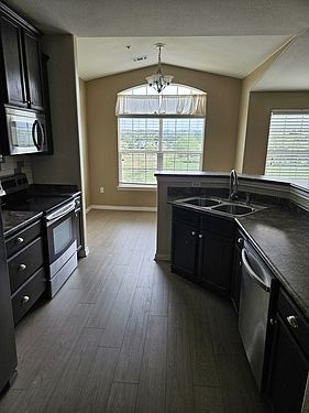 Beautiful, rare end unit penthouse level with vaulted ceilings, an abundance of windows and tranquil views. This well cared for home has a gorgeous kitchen with stainless steel appliances, 42" cabinets and conveniently opens to the family room. You will also enjoy the covered back patio that privately overlooks open space. New flooring throughout and a one car detached garage is also included. Pool community with access to Cherry Creek Rec Center about a mile away!