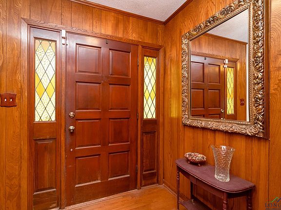 Nice ranch style home in Hallsville ISD features a formal living/formal dining room at the front of the home. The formal dining room is connected to a cute kitchen with glass front cabinets and tile countertops. There is a gas cooktop and built in oven. The living room features a vaulted ceiling with beams and fireplace with gas logs. Down the hall you will find 4 spacious bedrooms and 2 bathrooms. Hardwood floors throughout hall and bedrooms. Off the back of the home is an enclosed sunroom (cooled with a window unit) and equipped with a hot tub (negotiable). The laundry room is located just off the sunroom. Two outbuildings sit within the 1 acre fenced lot. Driveway actually comes off Redmon Rd but house faces Gum Springs.