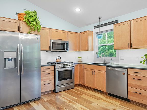 This ranch home is anything but ordinary. Step inside and discover a haven filled with upgrades. Kitchen features stunning maple cabinets, gleaming quartz countertops, and under-cabinet lighting. The vaulted ceiling adds to the feeling of spaciousness, and stainless steel appliances are included. Premium hickory plank flooring throughout the main level provides warmth, style, and easy maintenance. The living room seamlessly flows into the kitchen and dining area. Convenience reigns supreme with a primary suite on each level. Each suite boasts a walk-in closet for ultimate organization. The walkout lower level features a spacious family room plus the carpeting comes with a 20-year warranty. Enjoy the fresh air on the deck or relax on the patio in the fenced backyard.