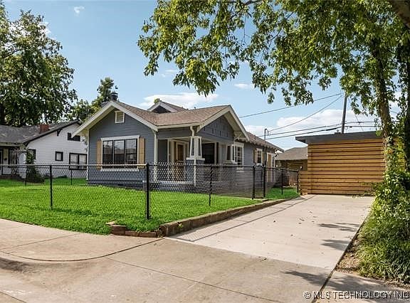 The master suite is your personal oasis, featuring a luxurious bathroom with a sleek, illuminated soap box and a stylish shower. The second bathroom includes dual shower heads, offering a spa-like touch to your daily routine. Adjacent to the master, a flexible room serves perfectly as a home office, nursery, hobby room, or exercise space. Throughout the home, refinished original hardwood floors highlight its timeless charm. Enjoy the scenic views of downtown Tulsa from the inviting covered porch.