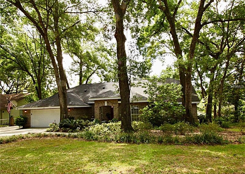 Golf Community living on a wooded lot, this 4 bedroom, 2 bath home is beautifully decorated and maintained. The elevated 440 sq. ft. veranda (under roof) overlooks the screened heated pool. Kitchen remodeled in 2009 with upgraded cabinets, granite and stainless steel appliances. Two car garage with built-in cabinets for storage. Master bedroom has large walk-in closet with built-in shelves. Vaulted ceilings add to the open space in the master bedroom, living room, dining room, kitchen and family room (Wood burning fireplace in family room). French doors in family room, living room and master bedroom open to the veranda. Ceiling fans in all rooms. Guest bathroom remodeled in 2014 has exit to the outside and the pool. New roof.