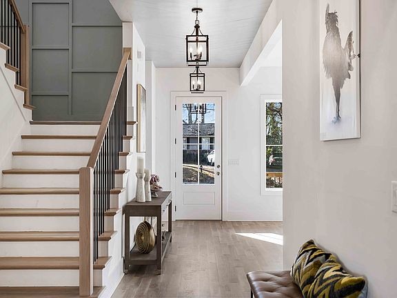 This beautiful home will impress from the moment you pull into the driveway. The home features a stunning dark gray brick exterior with contrasting white siding & a large front porch with custom pine accent columns. When you enter the home you are greeted by a spacious foyer filled with abundant natural light, custom tongue & groove millwork on the ceiling & a large dining room with access to the butler's pantry with a wine fridge. The family room is perfect for entertaining with a large open floor-plan complete with stunning white oak hardwood floors, custom fireplace with shiplap detail, beautiful built-ins on both sides of the fireplace, wood accent beams & sliding doors leading out to the covered deck! The kitchen is perfect for the chef at heart with custom maple cabinets on the bottom with smoky blue uppers for a pop of color, quartz counter-tops, stainless steel appliances, tile details, walk-in pantry with wood shelving & an island with plenty of room for seating. A guest bedroom with a full bathroom, large mudroom, powder bath & 2-car garage w/ storage finish off the main level. The master suite is located on the second level & features white oak hardwood floors, tray ceiling with custom accent beams & a stunning spa-like bath. The light filled master bathroom has a vaulted ceiling with accent beams, his & her custom maple vanities, soaking tub & INCREDIBLE tile shower with dual shower heads & a large jaw-dropping wrap around walk-in closet ready for customization. There are 3 spacious secondary bedrooms with private en-suites & a laundry room on the second level. Finishing off this home is a large unfinished daylight basement that walks out onto the beautiful flat backyard w/ room for a pool.