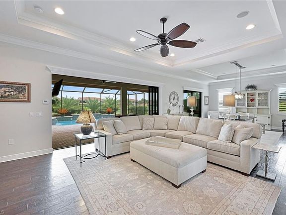 H11090. Welcome home to this stunning estate, positioned on an Oversized pie shaped lot at the end of a private cul-de-sac. The interior is generously appointed with a long list of custom upgrades including: gorgeous hardwood flooring and Crown Molding with enhanced ceiling details, custom plantation shutters, custom electric blinds, and Chef’s kitchen just to name a few. The open floor plan combined with wall-to-wall sliding glass doors seamlessly integrates the indoor-outdoor living space, making this home perfect for entertaining. The grand outdoor living area provides ample covered lanai space, outdoor kitchen, resort style saltwater heated pool and spa, linear pool fountain with spillover, & dedicated pool bath. Mature landscaping further allows you to appreciate the water and golf-course views, while retaining maximum privacy. Both seasonal and full-time residents will appreciate the peace of mind from double hurricane protection: impact windows and sliders throughout the home combined with New Rear Electric Storm Smart shutters to enclose the lanai and front entry. Our team invites you to come experience this gorgeous home and community for yourself! Maintenance Free living!