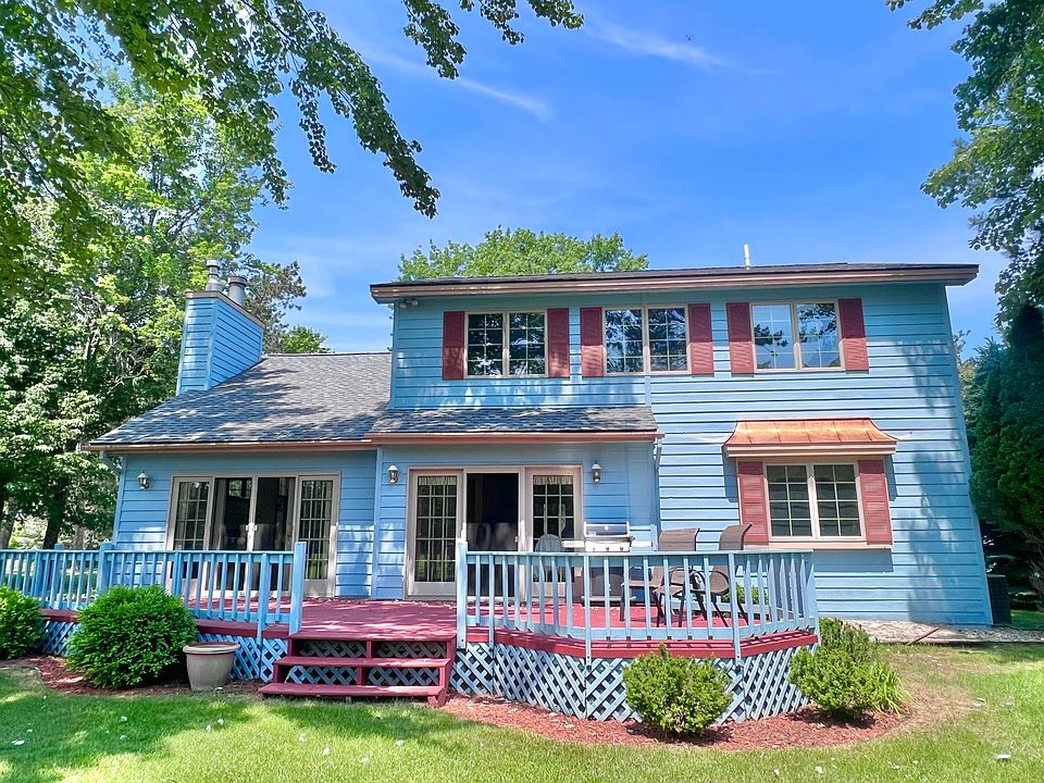 Impeccable attention to detail and clever craftsmanship is evidenced throughout this 1.5 story, custom home nestled greenside on Hole #2 at The Michaywe Pines Golf Course. Unique touches finished in copper include the lighted cupola that emits a warm glow at dusk, and the valance above the dining room window facing the golf course. This home is a standout on its street. Main floor primary suite, kitchen, living & dining room combo with wood fireplace and large deck for entertaining. 2 car attached, heated garage with side yard access. Full, finished basement with natural gas fireplace, bar, workshop, bathroom and non-conforming 4th bedroom enhance the size and space. The loft is currently set up as a bedroom, but is large enough to use as additional living space.