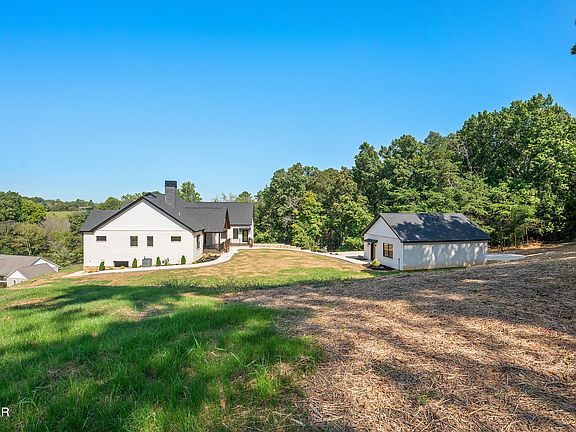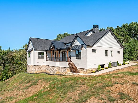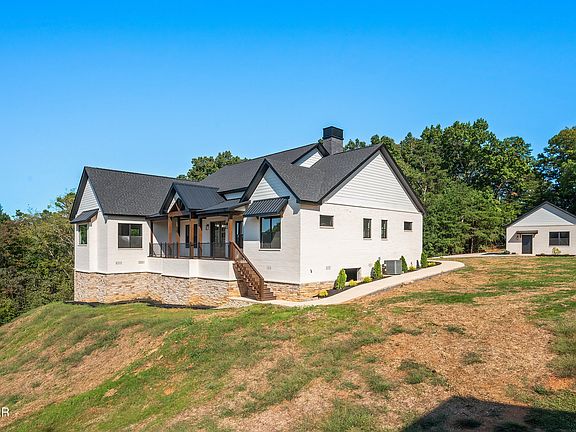 NEW CONSTRUCTION, built in 2024. Move-in-ready! Welcome to your dream home at 1869 Sierra Lane! This custom home sits in the community of Landmark Point in Sevierville Tennessee. Located on a quiet cul-de-sac, this truly is a one-of-a-kind property that is ready to become your forever home. Situated on approximately 1.70 acres, this single-level modern farmhouse gives a striking first impression with architectural detail throughout the outside and inside. These details include Marvin windows, Tamko roofing and beautiful brick and Provia stone from General Shale, which adds to the elegance and curb appeal of this home. The main floor is 3,900 square feet and has 5 bedrooms and 3.5 bathrooms. When you head up the driveway you are welcomed by an 850 square foot insulated, detached 3 car garage space with overhead storage. At the front of the home you are greeted by the custom wood stair case and iron railing. The 300 square foot front porch is finished with clear ponderosa pine T&G ceilings and top of the line ''Dec-Tec'' composite decking. This truly is the perfect place to look over the westerly open skies and Bluff Mountain. This property is nestled up to a tree forest and sits well off the street, giving you an eagle's nest view, so that your family can enjoy the sunsets and Tennessee nights with complete privacy! When you walk through the mahogany double front doors you are met with 10-foot ceilings and 8-foot solid core doors that are throughout the whole home. The foyer opens to an open floor plan layout and large windows that allows for an abundance of natural light. Off the foyer, is poised to be either a bedroom or home office with double doors that look over the front porch and expansive picturesque views.