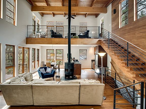 Contemporary home design on a cascading trout stream. This home's construction makes a statement and is one of a kind. Vaulted tongue & groove ceilings with exposed rafter beams, oak hardwood flooring, floating staircase with metal rails that lead to a loft, centerpiece wood stove in the open concept living area boasting natural lighting with walls of windows. Granite countertops & high-end appliances in the kitchen including a Jenn-Air gas range, beverage center & stainless breakfast bar. Step outside on the main level deck and relax to the white noise and creek views. Terrace level is dedicated to the master suite that was created with peace & serenity in mind. Master bath has a stacked rock shower with a stacked rock gas fireplace in the bedroom. Open the door to the screened porch or step outside to the outdoor oasis where you can enjoy the hot tub & listen to the rushing sound of the creek. The white noise can be heard from any room in the home. This home covers all the seasons: creek, cozy fires, nature and alot of windows to take all the views in! New HVAC & bonus storage space that is heated & cooled. Great location centrally located between Highlands and Franklin!