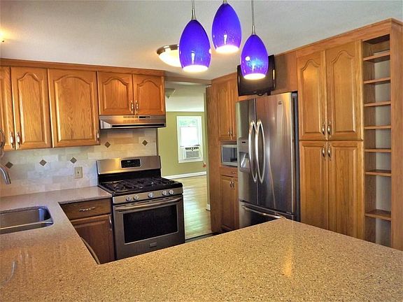 Neat, clean, spacious ..... just a few words to start. This colonial is set on a large, beautiful 3/4 acre lot with an oversized two-car garage with loft storage area, an attached 12x20 shed, two decks and a patio for your entertaining pleasure. Inside is a beautiful kitchen complete with quartz counters, thoughtful cabinetry, tv (which will remain) and a breakfast nook area over-looking the lovely yard -- this opens to the dining room with hardwood floors, bow window and access to an enclosed porch. The living room has a coat closet, bow window, hardwood floors and opens to the outdoor living deck area. The first floor also has a full bath with corner shower. The second floor has three bedrooms, a full bathroom with heated porcelain floor and opens to the master bedroom as well as the hall. The master bedroom has hardwood floors and a walk in cedar closet. If all that was not enough, there is a partially finished basement with another half bath and neat, tidy utility area.