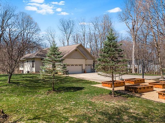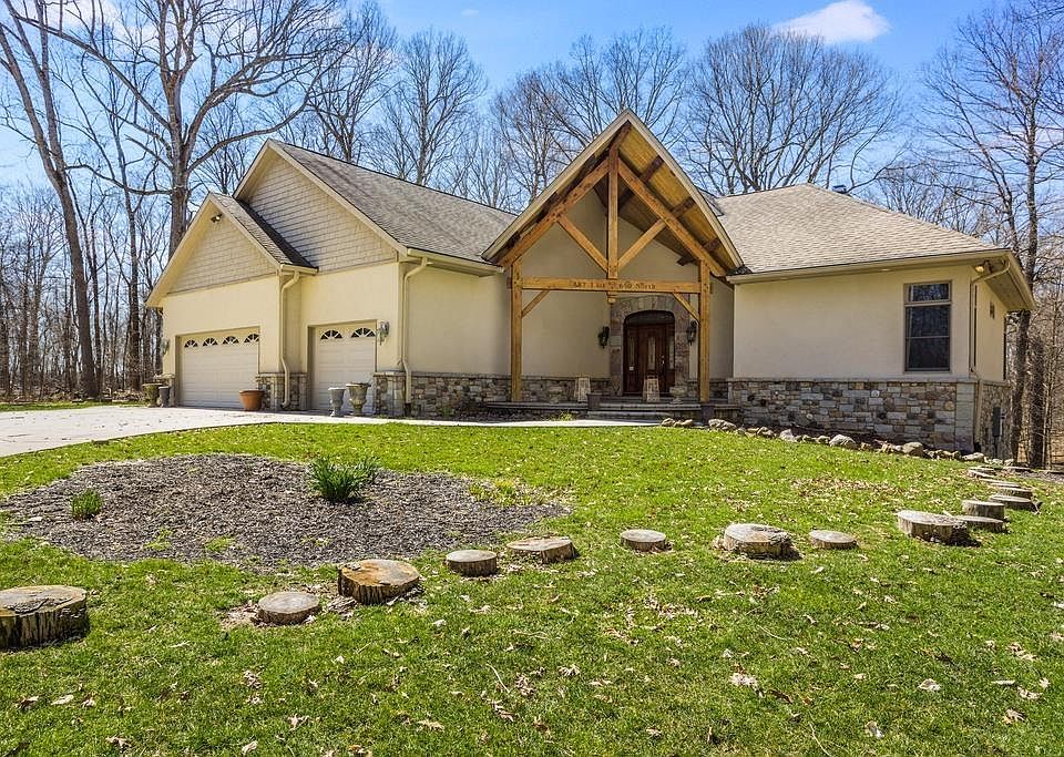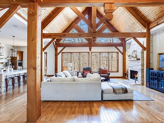Stunning! Attention to detail doesn't go unnoticed in this Dave Watkins custom built ranch on a walkout basement! Sitting at the end of a private drive, this home sits on 3.26 wooded acres offering an abundance of privacy. The property line is surrounded by a 20 acre parcel owned by a conservationist, so no nosy neighbors. Step inside and be greeted by grand wood beams, high vaulted ceilings, hardwood floors, a large open concert floor plan with windows boasting natural sunlight in all directions. The recently renovated kitchen offers a vast kitchen island with 6 burner gas stove, custom cabinetry drawer, brass handles, corner drawers, double ovens, new dishwater/refrigerator, new quartz counter tops and custom European backsplash. Step into the luxurious master bedroom w/ en suite, offering vaulted ceilings and private sunroom, perfect for sipping coffee and watching nature cross through your yard. Main floor laundry with tiered shelving, and two large bedrooms on the opposite end of the main floor with a Jack & Jill bath. Travel downstairs to the walkout basement and you'll find a massive great room, with wooded coffer ceilings! There is a spacious 4th bedroom, custom built bookshelf, and a 3rd full bath. Find the flex room perfect for whatever you may need. Step out the tall doors onto a patio ideal for relaxing or entertaining in the warmer months. Property includes a whole home generator, water filtration system, and so much more! Come take a look at all the beauty this home has to offer!