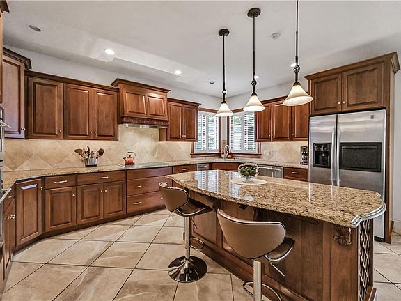 - Description: Beautiful bar w/seating for 6, granite, custom cabinetry, beverage fridge, sink, microwave, tile flooring, recessed/pendant lighting.