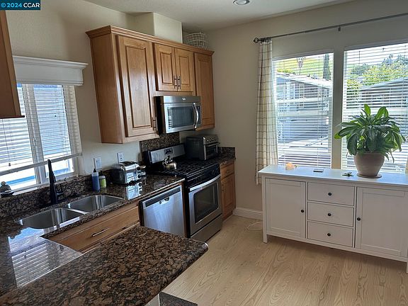 This 2 Bedroom 1 Bath Manufactured Home is located in Concords Finest Mobil Home Park. This 700 Square Foot Home really lives Big thanks to 9 FT Ceilings. Beautiful hardwood floors, nice sized Living Room, Eat In Kitchen and an inside Laundry. Kitchen features Granite Counters and Stainless Appliances. Fenced in Rear Yard With Storage Unit and Newer Redwood Deck. Close to Schools, Shopping, Transportation and BART.