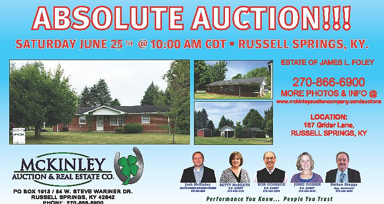 Selling on behalf of the Estate of James L. Foley on Saturday June 25th @ 10:00 am cdt This nice 3 bedroom brick home situated on 0.32 ac. corner lot, with carport and blacktop driveway. For more information please contact selling agents at 270-866-6900 or visit our website @ www.McKinleyAuctionCompany.com/Auctions