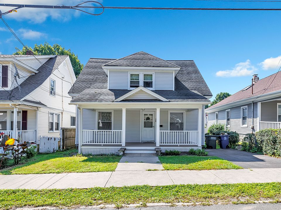 Lovingly maintained classic cape with large front porch great for relaxing or entertaining. Enter the home into the spacious dining room with hardwood floors, ceiling fan and open staircase. The living room has plenty of light, ceiling fan and double doors leading to the main level bedroom with a closet. The kitchen has an eat in area and door to the half bath with washer. There is also a utility room in the back with access to the rear deck. The second level has a nice sized bath with a tub/shower and 2 windows. There are 3 spacious bedrooms on the second floor all with hardwood floors. The main bedroom has a large walk in closet. The rear yard has a deck overlooking a level lot. The house has updated vinyl siding and windows with trex decking on the front porch. This home has great bones and it is ready to make your own!