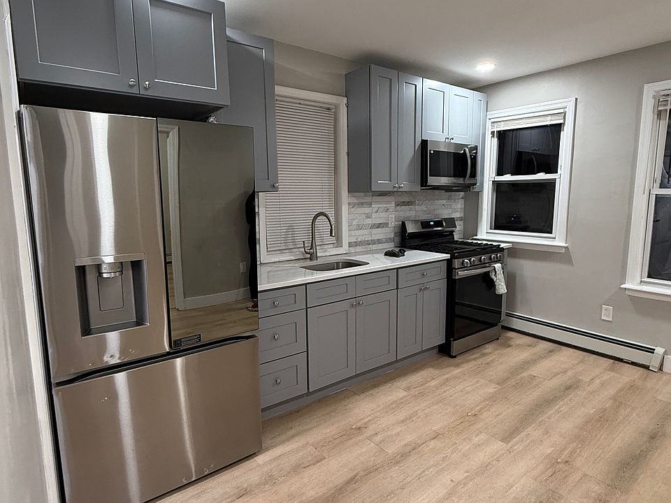 Newly renovated apartment with living room space, 2 bedrooms, eat in kitchen. Close to public transportation, schools, and shopping centers. Owner occupied. Tenant pays gas and electricity. Landlord pays for water. NJ standard application, background check, credit report and interview required. Broker's fee applies.