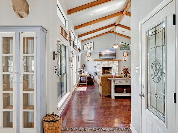 Discover an exceptional property at 187 N Roy Chisum Road in Leakey, Texas, where the pristine headwaters of the Frio River grace the estate, offering a serene and picturesque setting. This meticulously maintained 3-bedroom, 3-bathroom residence spans 3,120 square feet and is situated on a 1.1-acre lot approximately 6 miles north of Leakey. The kitchen is a culinary delight, featuring built-in appliances, granite countertops, and high ceilings. The open floor plan includes two fireplaces, creating a warm and inviting atmosphere. Spacious bedrooms and large closets provide ample storage, while the huge screened porch offers tranquil views of the river. An open rock patio and a stairwell lead down to the landscaped riverside, complete with a swimming and fishing dock, perfect for outdoor enjoyment. The property boasts a detached barn, a two-car carport, an RV port, and a workshop, catering to various needs. The fenced and manicured yard, adorned with numerous trees, offers a well-shaded retreat. Notably, this subdivision has no HOA, ensuring freedom from additional dues. Take in the Frio River, known for its wide, deep, and crystal-clear waters lined with majestic cypress trees.