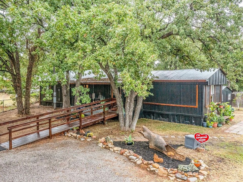 A piece of lake heaven with serene surroundings, with peach, plum trees and grapevines, all producing. This home can be your lake house, vacation home or permanent residence. Large open concept living, dining room and kitchen. Beautiful large kitchen with decorative lighting, island and eat-in kitchen space. Owner suite is a peaceful retreat with a sitting area. Gorgeous bathrooms with wheelchair accessibility. Beautiful ramp entrance to this welcoming warm home. Guest bedroom has an adorable half bath for privacy for your guest. Stunning dining room from floor to ceiling, room to seat all of your family and friends. The front entrance has a screened in beautiful, covered patio 23x6 perfect for your morning coffee, afternoon tea, or evening cocktail. Room for your lake toys and RV. Beautifully landscaped with drought tolerant plants, a must see. This community boasts with so many amenities, saltwater pool, boat dock, boat ramp, fishing pier, playground, fire station, community events.
