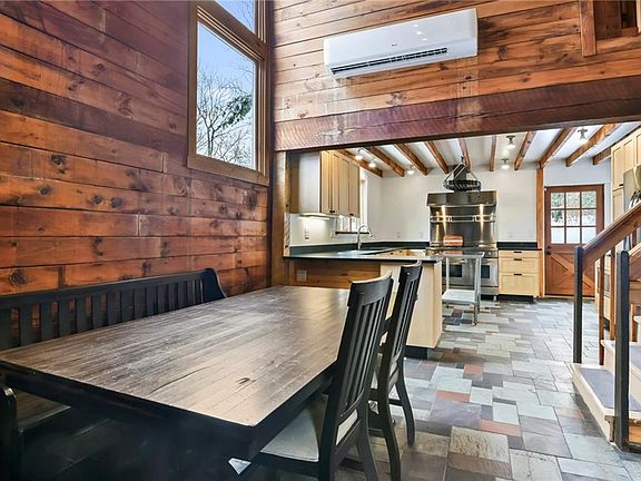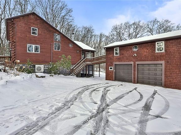 Beautiful Rustic Custom Log Home set on 6.6 Peaceful Acres (2 Lots). Feel like your on vacation all the time in this Lodge like home featuring over 3000 sq ft of finished space offering craftsmanship throughout. Newer kitchen with a professional Bertazzoni 6 burner stove and Brazilian soap stone counters, open dining room with wood stove, great room features large fieldstone fireplace, slate floors throughout, vaulted beamed ceilings. 4 season sunroom with expansive windows letting in natural light for you to enjoy the beautiful surrounding views. This room walks out to a walkway leading to bright studio/office space above 2 car garage with mini split (heat/ac). Main bedroom on first floor and full bath. 2nd level offers 3 bedrooms and full bath. Lower level with stone fireplace, flagstone floors, family room, ½ bath and laundry walks out to screened room. Wonderful indoor/outdoor space. Great location--tucked away with access to everything. HIGHEST AND BEST Tuesday 1/30 10 am please.