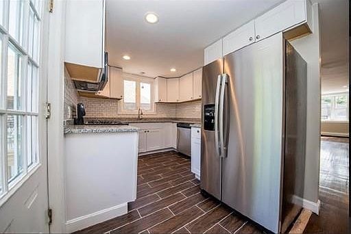 Large 4 bedroom 2 bath Colonial located in the center of Acushnet. This home has been completely remodeled leaving nothing left to do but move in! Brand new kitchen with white shaker cabinets and granite counter tops. Matching Stainless steel appliance suite to complete the look. Beautifully finished hardwood floors throughout. 3 bedrooms located on the 2nd floor with large closets and the 4th spacious bedroom privately located on the 3rd floor. 1st floor full bath freshly tiled and a 2nd full bath located on the second floor offers a tiled jacuzzi tub and a stand up shower. Off street parking for up to 4 cars. Large fenced in yard with a large shed for storage.