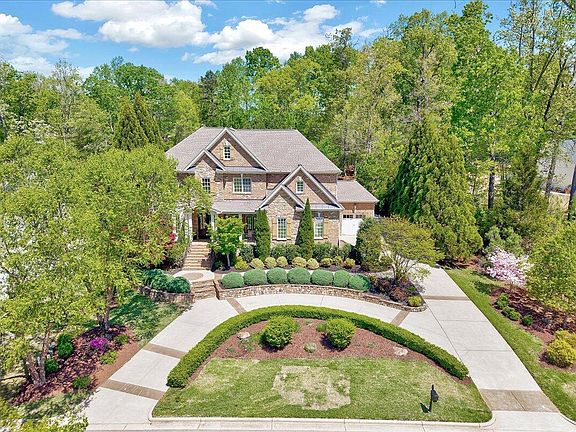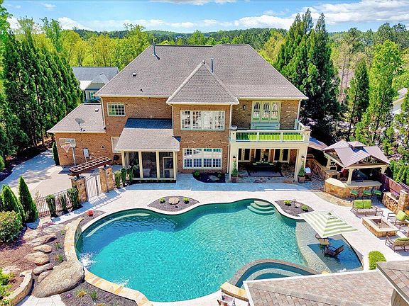 A Masterpiece of Design & Lifestyle! Set in a gorgeous GATED community, this breathtaking custom estate blends elegance, comfort, and entertainment in a way few homes can. Offering 5 bedrooms, nearly 6,800 sq ft, including a 2,000 sq ft luxury pool house, this one-of-a-kind property redefines indoor-outdoor living. Inside, you'll find soaring 10-ft ceilings, detailed trim work, and 3 fireplaces that set a warm and sophisticated tone. The chef's kitchen impresses with a massive island, butler's pantry, built-in appliances, gas range, and prep sink—perfect for entertaining. Two private offices on the main level provide ideal flexibility for work or guests. Upstairs, four spacious bedrooms and a bonus room complement the lavish primary suite, complete with a sitting area and private yoga/meditation porch overlooking the pool. Step outside to a private resort setting: a 50,000-gallon lagoon-style pool with hot tub, 1,500 sq ft of covered outdoor living, an outdoor kitchen, fire pit, and lush landscaping framed by a 60-ft wooded buffer for privacy. The incredible pool house delivers the ultimate in luxury—featuring a sauna, entertainment bar, 2 fireplaces, 1,000-bottle wine cellar with speakeasy room, guest suite, and second living area. Additional highlights include: 3-car garage, screened porch, basketball court, circular drive, and a 1,200 sq ft walk-up attic with 13-ft ceilings. Exclusive community amenities add even more: a 3-hole practice golf course, trails, clubhouse, and gym—all minutes from Jordan Lake, The Preserve Golf Club, Chapel Hill, Pittsboro, and RDU Airport. If you've been waiting for a home that truly has it all—this is it.