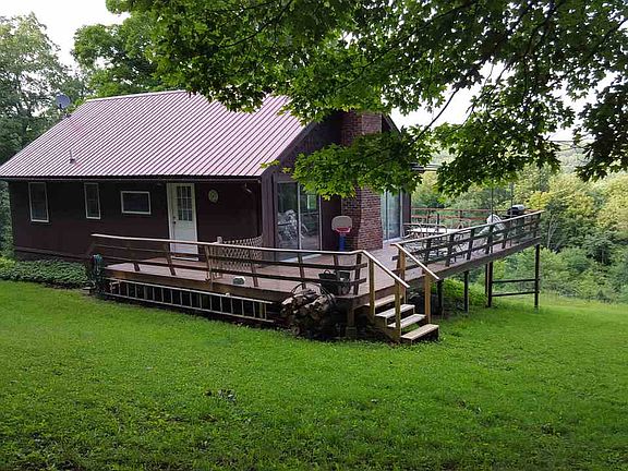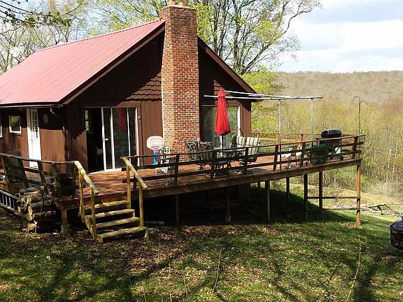 Picture perfect! Mountain top chalet type very secluded 2 bedroom with sleeping loft/bonus room, 1.5 full bath, great room with a wood stove, beautiful mountain views, large wrap around deck, and full unfinished garage/basement for expansion. The property has sloping terrain with plenty of flat land to use and a spring fed pond.
