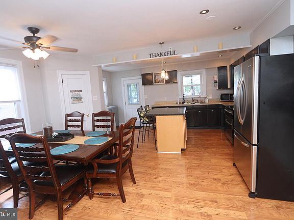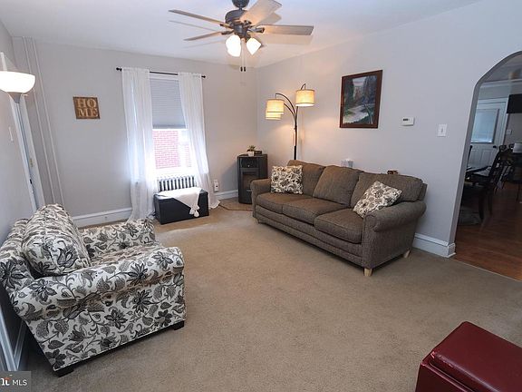 Welcome to this Charming 4 bedroom, 1 bath Twin home in Telford Borough. It starts with an inviting covered front porch a perfect spot for morning coffee. Enter into the Family Room with a pellet stove to keep you toasty on the cold winter nights. The front living room works great as a den or home office. There is a huge fabulous retro kitchen with dining area (20 X 17) featuring plenty of cabinets, counter space, island with seating, pantry, dishwasher, electric stove with double ovens, refrigerator (included) and rear door that leads to covered 12 X 12 covered deck which is perfect for outdoor dining. On the 2nd level is the main bedroom and 2 additional bedrooms with a remodeled hall bath with tiled bathtub. The 3rd floor features the 4th bedroom with storage closets. A heated basement with laundry area, plenty of storage and outside exit. Detached oversized 1 car garage with garage door opener and off-street parking for 2 cars behind the garage. Located in great Souderton School District. Easy access to major highways, great restaurants, parks and library close by. Just pack your bags and move in!