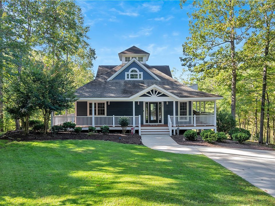 This Island Cottage sits on a point lot with approx. 300’ of shoreline in Waters Edge gated community. Discover serenity in this beautifully updated 5-bedroom, 4-bathroom lakefront home, nestled on a quiet cul-de-sac. The open floor plan is perfect for modern living, offering seamless flow between living spaces, while large windows provide stunning lake views. Enjoy outdoor living with both a screened porch and a wrap around front porch, perfect for relaxing or entertaining.