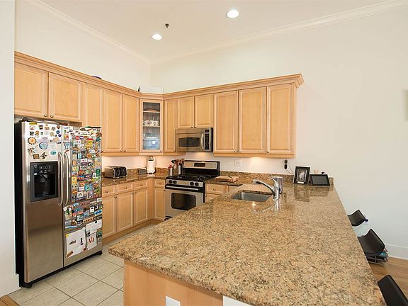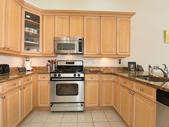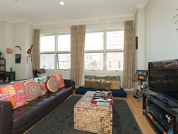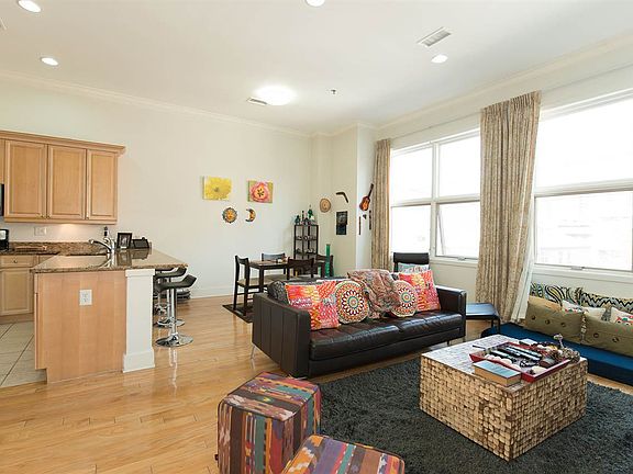 This well-designed 2 bedroom home has an open floor plan and features 12 foot ceilings, hardwood floors, and a wall of windows with custom treatments, which create a bright and comfortable space, perfect for entertaining or just kicking back. The kitchen features custom cabinets, stainless steel appliances, granite countertops, and tiled floor. The large master suite includes a large shower. The second bath has granite countertops and a soaking tub. Parking space included! Located in a secure, elevator building. Walking distance to the PATH & Light Rail.