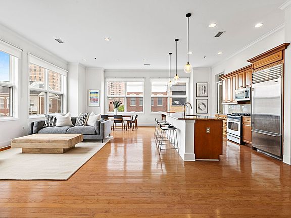 Penthouse perfection on Paulus Hook. 1,600 sq. ft. of living space plus two enclosed balconies, this south-east facing corner unit presents a unique opportunity for remarkable living, just moments away from the Waterfront. As you enter this spacious 2-bedroom, 2-bathroom home, your attention is immediately captivated by the soaring 11-foot ceilings and expansive gallery-sized walls. Bathed in abundant southern light, the oversized Pella windows offer picturesque views of a charming tree-lined street and a breathtaking urban skyline. Designed with entertainment in mind, the light-filled living area seamlessly connects to the dining and kitchen spaces, adorned with ample cabinet and counter space. The generously sized dining nook comfortably accommodates family gatherings or hosting guests, providing ample space for a party of ten. The two enclosed balconies seamlessly extend your living spaces and provide ample room for a variety of uses. Whether you envision a cozy reading nook, an alfresco dining area, an exercise nook or a verdant container garden, the space is yours to personalize. Recent upgrades include a new Trane HVAC system, new Rheem Performance 47 gal. water heater, new LG washer & dryer and a new GE Profile microwave. Additional highlights include central air conditioning, a home master reverse osmosis water filtration system, a Sub-Zero fridge with preventative maintenance done, modern window blinds and Casablanca ceiling fans in the bedrooms. The oversized master bedroom accommodates a king-sized bed with room for a sitting area/ workstation/exercise corner and more. The en-suite bathroom exudes elegance with its chic tiles and features a walk-in shower, creating a spa-like experience. Throughout the home, you'll find plenty of overhead storage space, allowing for easy organization and decluttering. Liberty Pointe is 30-unit, boutique, steel and concrete elevator building, with a beautiful common courtyard with green space and outdoor BBQ, conveniently located near a variety of restaurants, eateries, coffee shops, retail shops, lounges, parks, Citi bike stations, Wholefoods market and only two blocks from the Waterfront boardwalk and marina. Exchange Place PATH train, NY Waterway ferry, and Light rail just blocks away for easy transport to NYC. The neighborhood also features excellent public and private school options including top-rated PS 16, the River School, Waterfront Montessori and St. Peter's prep. A deeded garage parking is included with the home