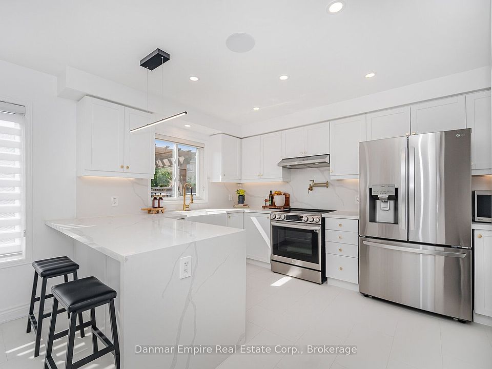 Timeless renovated residence, thoughtfully upgraded with top-of-the-line finishes throughout. This home features a designer gourmet kitchen featuring a waterfall quartz island, stainless steel appliances, pot filler, farmhouse sink, and a stylish backsplash. The main and upper levels showcase hardwood and modern ceramic floors, an elegant oak staircase, pot lights, and smooth ceilings. The primary suite provides a fireplace, a beautifully renovated 5-piece ensuite and a walk-in closet with custom organizers. The finished basement offers a cozy fireplace, wet bar, upgraded laundry room. Additional highlights include built-in speakers throughout and integrated WiFi pods for seamless connectivity. The fully fenced backyard features a composite deck, pergola, and outdoor speakers, perfect for entertaining. Turnkey & move-in ready! Please see attached schedule for additional upgrades and features.
