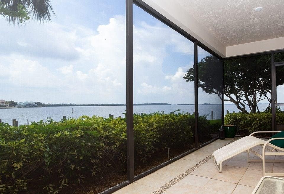 Desirable corner unit with endless sunset views! Convenient first floor location near enclosed garage. Master suite with 2 private full baths. Split bedroom plan, screened porch and TWO docks! Larger dock located in protected marina with water & electricity. New impact windows in master & guest room. Pet friendly: one pet under 20-lb. Sizes approx. Buyer to verify.