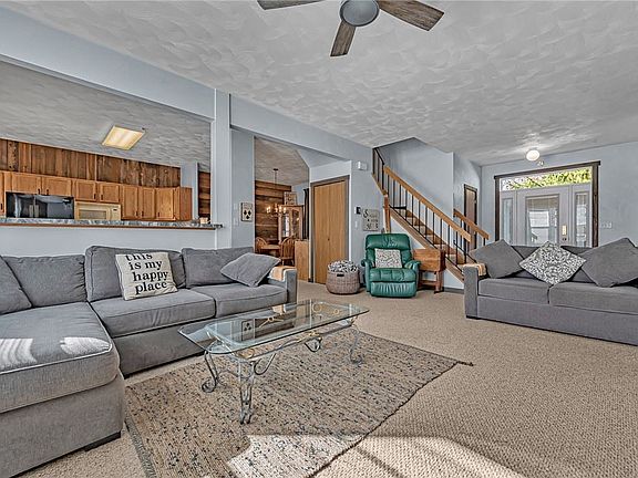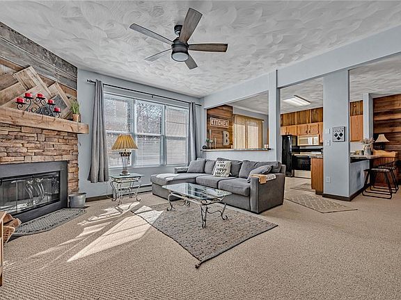 Eagles Ridge Townhouse with a GARAGE!!! Perfect Location backing the pond and walking distance to the South Ridge Swimming Pool & Recreational Area. This resort home is in great condition and has been well cared for. Sold Turn Key & Furnished for you to move right in for ski season! Built in bench area, barnwood accent walls throughout, built in buffet area in dining room and new countertops in kitchen. It is an open floor plan with the kitchen open into the family and dining rooms. Sit on the back deck and listen to the fountain in the pond as you enjoy your morning coffee. There is a powder room on the main floor as well. The Master bedroom has two closets and a full bathroom. The Bonus is the one car garage with some space for storage and there is additional space to park in the driveway!