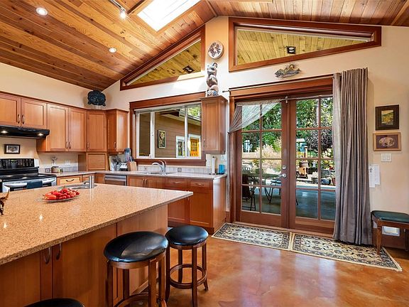 Vaulted kitchenLake viewsRadiant in-floor heatingDeer-proof fenced yardRaised garden bedsMulti-car split garageFrench slate