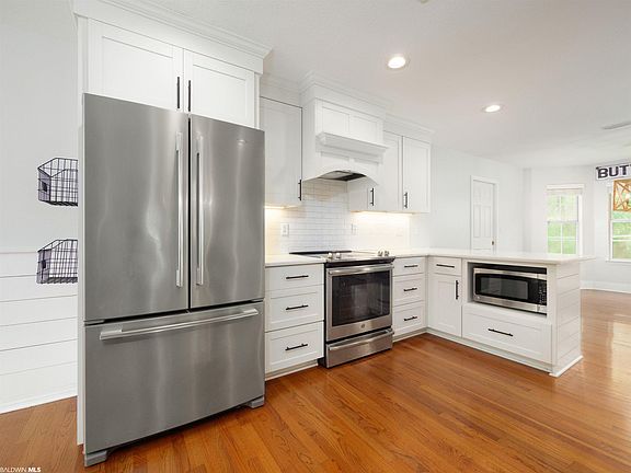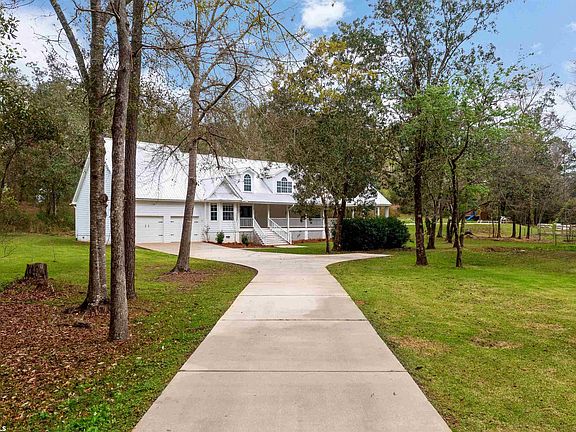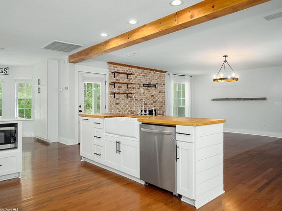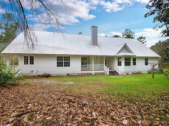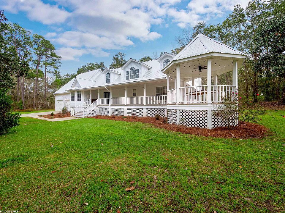 Have you been searching for the perfect white farmhouse?! You've found it! This picturesque home features concrete siding, a metal roof, double garage, 2 ponds and in ground pool, all situated on 3 acres in storybook Silverhill, Alabama! With 2,202 sf, the home features 3 bedrooms with the primary on the first floor and 2.5 baths plus an office and large utility room. The kitchen is most definitely the heart of the home boasting granite and butcher block countertops and custom, crisp white cabinetry. A warm wood beam and cozy wood burning fireplace join the kitchen and living areas, truly allowing for an open concept floor plan. Flooring is a combination of wood, luxury vinyl plank and tile. Inside and out, you'll fall in love with the upgrades this home features, as well as the privacy the 3 acre lot allows which includes mature trees and concrete drive. Conveniently located between Fairhope, Robertsdale and Foley, making any commute a breeze! Don't miss the opportunity to call this one-of-a-kind property HOME!