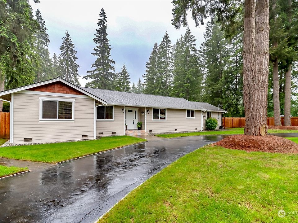 Privacy abounds as you enter the long circular, gated drive of this immaculate 3 bedroom, 2 bath, single-level home on a half-acre lot. The open concept is warm and inviting with gleaming hardwood floors and new wood blinds throughout that features a light and bright eat-in kitchen which includes newer appliances, gas range, breakfast bar, quartz countertops and beautiful cabinets with ample storage. Bathrooms were renovated with fully tiled walk-in showers and quartz vanities. The fully fenced backyard, with privacy foliage along the perimeter, awaits you to enjoy the beautiful summers of the Pacific Northwest. This gem is move-in ready so don't miss this opportunity!