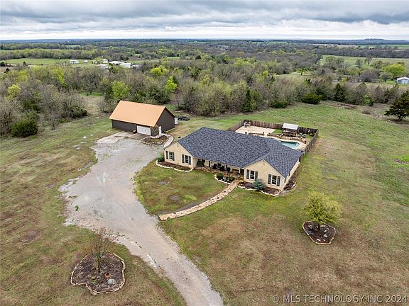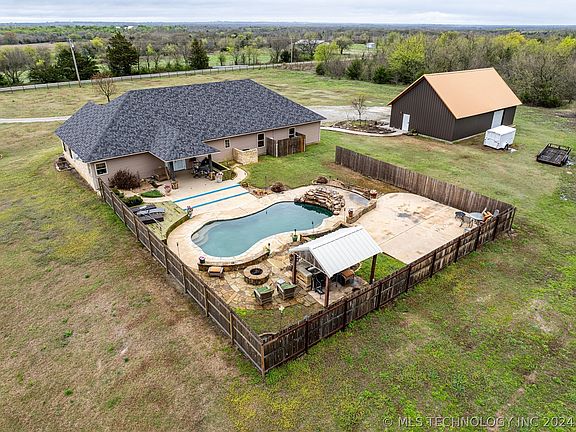 Gorgeous custom home located on five acres just outside the city of Madill, OK. This spacious Oklahoma home is loaded with farmhouse style, from the shiplap walls to the exposed rough sawn beams, it does not disappoint. The open floor plan is perfect for entertaining, and the kitchen is a must see. The inset range and vent hood are backed by a copper wall with an exposed wood beam above, and the center island holds the microwave and lots of storage. Step outside the back of the home into your own summer oasis, where the covered patio opens out to a serene setting with a heated pool, firepit, and cookout area. Just off the south edge of the home is a 40 x 50 shop that is large enough to protect multiple vehicles and still have room for storage and work space. Don't miss this incredible property!