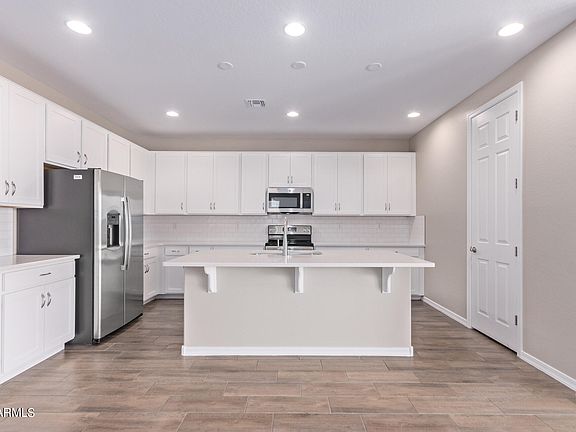 Welcome home to this professionally designed new build on an oversized corner lot spanning over 9100 sq. ft., facing north for optimal sunlight! This stunning abode features an open floor plan with 9' ceilings, paver driveways, and luxurious quartz countertops in the kitchen. The 42' white kitchen upper cabinetry, subway tile backsplash, and wood-like plank tile flooring in the main areas add elegance and charm. Step out onto the covered patio and enjoy the upgraded stainless steel appliances, including a side-by-side refrigerator. This move-in ready home also includes a washer, dryer, and blinds for your convenience. Embrace a lifestyle of luxury and comfort in this exceptional residence!