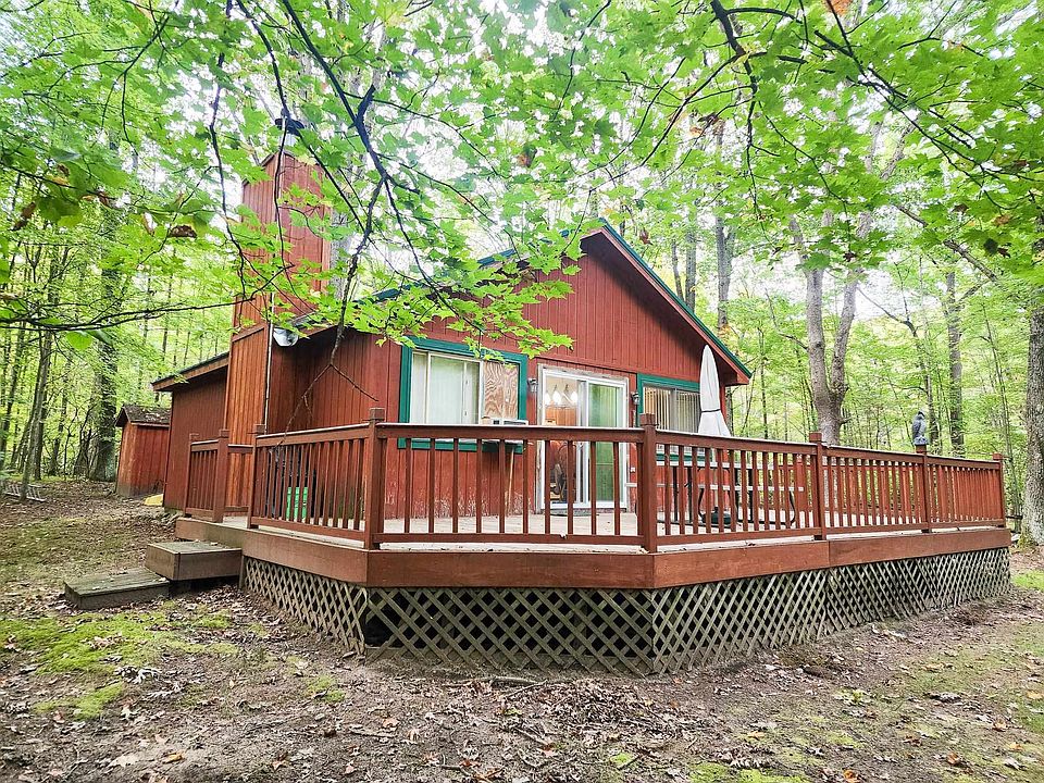 Escape to your private retreat! This cozy 2-bedroom, 1-bathroom cabin, built in 1991, offers the perfect blend of comfort and convenience. Situated on 1.47 acres across two spacious lots, this property ensures ample space for relaxation and recreation. Step inside to discover a welcoming open layout featuring a cathedral ceiling that enhances the feeling of spaciousness. The eat-in kitchen and living room are designed for both casual living and entertaining. The living room boasts a cozy wood-burning fireplace and newly installed skylights, creating a warm and inviting atmosphere. The home includes a stackable washer/dryer tucked away in the closet and comes fully equipped with all appliances and most furnishings—making it truly turn-key. With beds and a sleeper sofa, you can comfortably accommodate up to 9 guests. Enjoy the outdoors on your expansive 24x16 deck, perfect for gatherings, while the included firepit provides an ideal spot for evening relaxation. The second lot features its own driveway, septic, and electric setup, making it perfect for camper guests. With a well-insulated ceiling (approx. 18 inches of blown insulation) and a vapor barrier in the crawl space, this cabin is designed for year-round comfort. The metal roof is 7-10 years old, and a new drain field was installed in 2024, ensuring peace of mind. Located in the gated White Birch Recreational Association, you'll have access to an array of amenities, including an indoor heated pool, four lakes for fishing, kayaking, or swimming, and two private beaches. Enjoy recreational facilities such as tennis courts, pickleball, and basketball hoops, making this community perfect for outdoor enthusiasts. Don’t miss your chance to own this secluded gem! Schedule a private tour today and experience all this beautiful cabin has to offer.