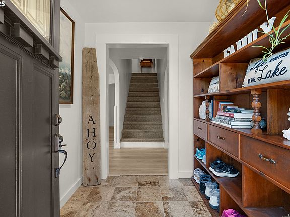 Welcome to this beautifully updated modern farmhouse, ideally situated on over half an acre and set back from the road for added privacy. The warm curb appeal is matched by a large front yard, inviting front porch, and thoughtfully designed outdoor spaces including a concrete patio, privacy fencing and a hot tub retreat. Inside, you'll find radiant heating on both levels, an office on the main level, wide picture windows and charming touches like wainscoting and arched doorways. The living room features a cozy gas fireplace framed by custom built-ins, creating a perfect place to gather. The large kitchen is designed for functionality and style with updated appliances, gas cooktop, built-in oven and microwave and ample cabinet space. The main-level primary suite has a large walk-in closet and a beautifully remodeled ensuite bath with dual sinks and modern fixtures. Upstairs there are two additional bedrooms and a full bath. A 34 x 40 foot two-story shop offers a variety of opportunities, plus there’s plenty of off-street parking for RVs, boats, or toys. With Warrenton C1 commercial zoning, the possibilities are as expansive as the property itself. Whether you're seeking a full-time residence or a flexible investment, this thoughtfully maintained property checks all the boxes.