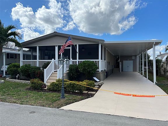 Remarkably Beautiful and Well Maintained, Fully Upgraded manufactured home with land in 55+ Community. 3 large bedrooms, 2 Full Baths. Split Plan. Wood Laminate and Tile Floors. Knock down ceilings. Newer smoked stainless steel appliances includes microwave. Has an indoor laundry room with washer and dryer. 2 storage sheds. New Galvalume Metal Panel Roof in 2023 Rated 300 MPH w/ 40 Yr warranty. Hardboard skirting. Accordion Hurricane Shutters for every window. New front storm and screen door. Concrete stamp driveway freshly painted. Window Blinds Included. Can close in quickly. Great community with 3 community pools, activities, shopping and restaurants nearby, 10 minutes to the Ft Laud Intl airport, and close I-595, I-95 and the FL Turnpike.