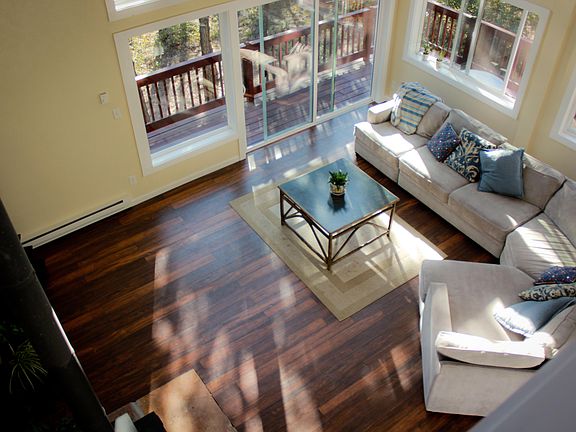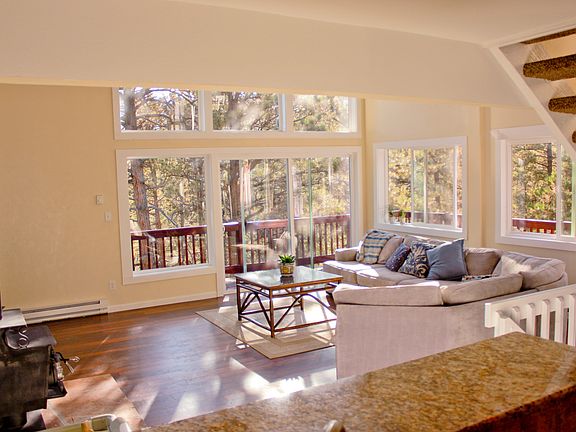 Secluded home on a private flag lot nestled in the tall towering pines with serene mountain views on a one acre lot! This custom built home has tons of wonderful features including large great room with floor to ceiling windows and a 20+ foot moss rock fireplace, finished walkout lower level and wrap around redwood deck. Newly remodeled gourmet kitchen with beautiful custom cabinets, new stainless steel appliances, slab granite, and tile. One acre lot! Passive solar and wood burning stove for low heating bills.
