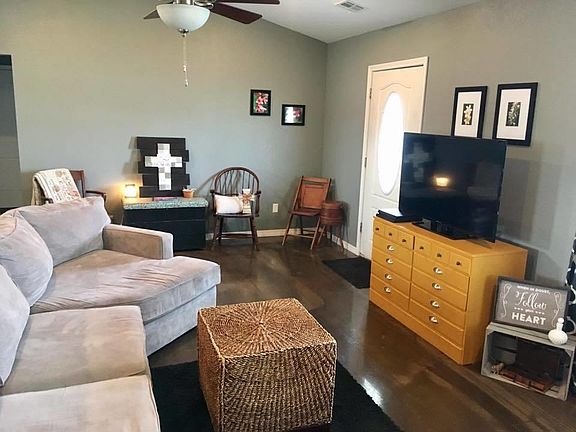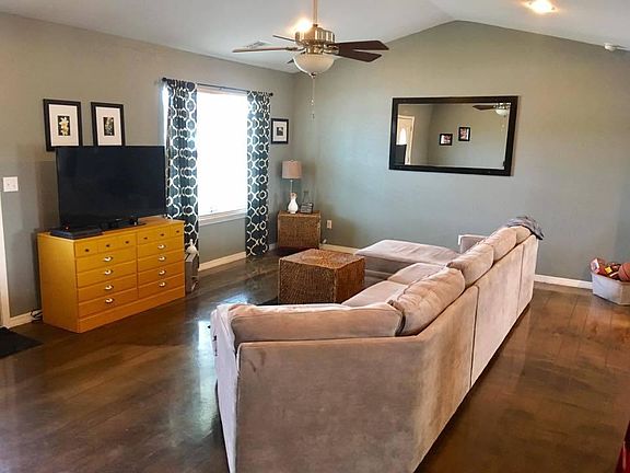 Adorable place to call home! Open floor plan with cathedral ceilings, stained and scored concrete floor, kitchen has large island and all stainless steel appliances that stay with the home. Large master suite with trey ceiling, master bath has stone & tile walk-in shower, jetted tub, and double vanities, large walk-in closet has a tornado safe installed. 2 car attached garage. Covered front porch. Oversized lot.