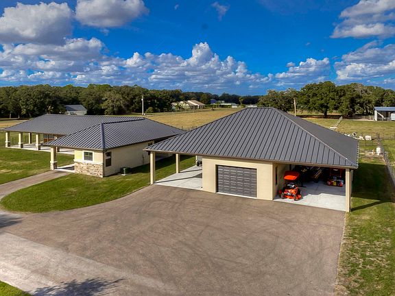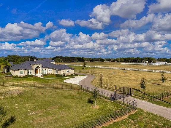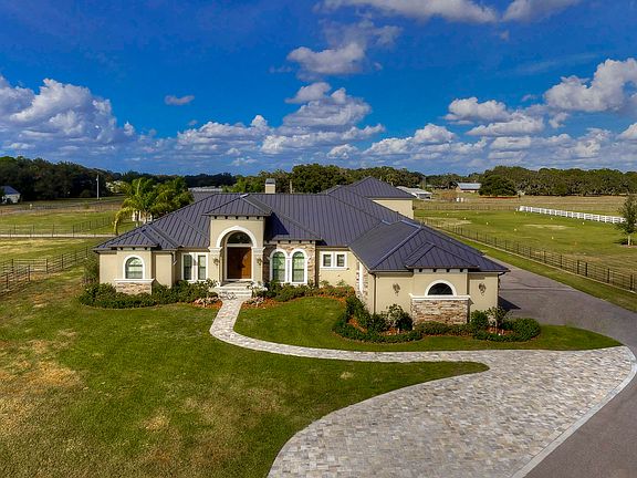 This home is an EQUESTRIAN'S dream, offering 5 acres, 3,689 sq ft barn w/ five 13x14ft stalls, 2,752 sq ft foot shop with man-cave/shop & feed storage, covered RV trailer parking & walking distance to Chito Branch Reserve that is 5,000 acres and features riding trails! Built in 2015, this home is NEW! The moment you arrive you will fall in love w/ the curb appeal, private gate & extended driveway that leads all the way back to the horse stalls! Inside is luxury at its finest. Features throughout include: engineered hickory wood floors, plantation shutters, solid core doors, Sonos sound system & even heated floors in the bathrooms! This floor plan features a separate space for everyone in the family while keeping the kitchen & family room in the heart of the home! This kitchen boasts custom cabinets, granite counters, tile backsplash, Thermador appliances, center island, walk-in pantry & much more! The family room is open to the kitchen & offers oversized sliders to the lanai & built in entertainment center that fits a 75" TV! Master suite is a true retreat w/ his & hers walk-ins & spa-like en-suite. At the back of the home is a lovely in-law suite w/ a bonus room/living area & attached bedroom suite. Two more bedrooms downstairs offer walk-in closets & en-suites. Upstairs is a teenager suite w/ two bedrooms sharing a Jack&Jill bath & full laundry set up! Screened & covered lanai boasts swimming pool & spa w/ swimjet system. This is the perfect home to raise a family & is zoned for amazing schools.
