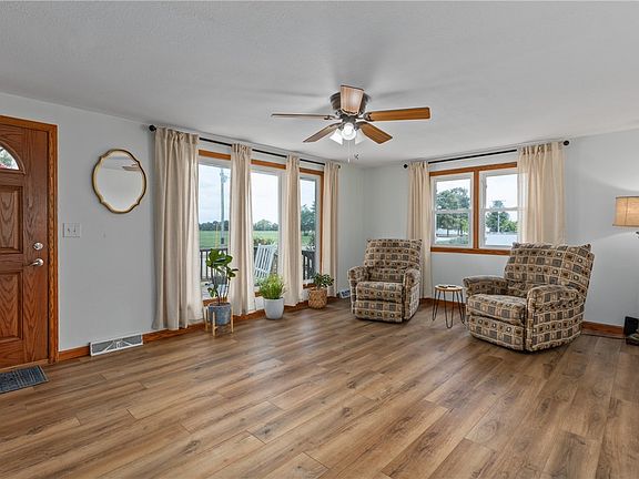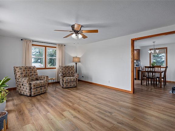 Discover the charm and comfort of this inviting 1.5 story home, perfectly situated on a generous .6-acre lot. Boasting a total of 998 square feet on the main floor and an additional 450 square feet upstairs, this residence offers ample space for both relaxation and entertainment. Step inside to find new Luxury Vinyl Plank flooring throughout the main level, adding a touch of modern elegance to the cozy interior. The main floor features two bedrooms and a well-appointed bathroom, while upstairs, a private third bedroom and another full bathroom await, providing flexibility for guests or a growing family. With a full unfinished basement, there's potential for additional living space or storage, allowing you to tailor the home to your specific needs. Located just behind the midway, this home offers both privacy and convenience! Don't miss the opportunity to make this house your home - schedule a showing today and envision the possibilities!