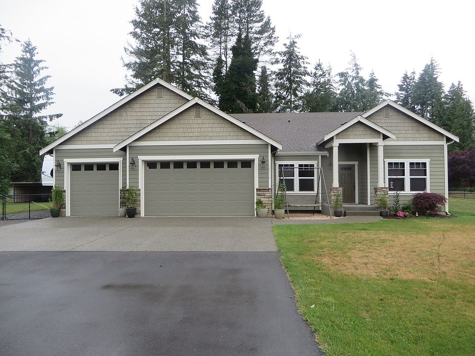 Beautiful 3 bd, 2 and 1/2 bath, close-in rambler on 5+ acres! This immaculate 3 car garage home offers high-end finishes, covered back patio w/double sided fireplace for year round enjoyment, security system, generator ready, fully fenced backyard and so much more! 1 acre of yard for enjoyment w/balance in protected Native Growth for privacy and wildlife. Don't miss this, minutes from I-5!