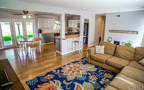 Comfort from the inside out! Great single story home with features that include copper plumbing, upgraded a/c, furnace, electrical panel and dual windows! Nice open floor plan with attractive wood laminate flooring sweeps you through the family room, dining area and kitchen. Recessed lighting in the family room which opens to the updated kitchen that features butcher block counter tops, subway tile backsplash, farm sink with newer faucet, stainless appliances, recessed lighting, breakfast bar area and french doors to the yard. Dining area in kitchen with ceiling fan. Master bedroom has ceiling fan and private bath. Secondary rooms with wood wainscoting and ceiling fans. Guest bathroom has upgraded vanity, fixtures and tile shower/tub combo. Good sized yard with above ground jacuzzi, firepit and covered patio - perfect for entertaining! 2 car garage plus extra parking!